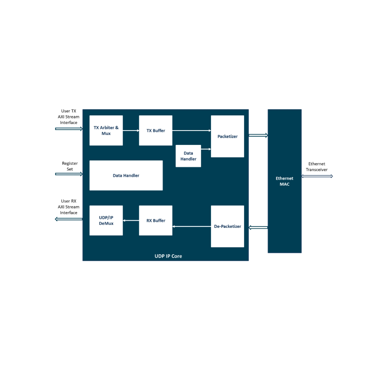 iWave’s UDP/IP Core is a high-performance IP solution that enables hardware-accelerated UDP communication over Ethernet, achieving data rates up to 40Gbps. Designed for FPGA-based applications, it ensures low-latency, processor-independent data streaming and network communication. This makes it ideal for real-time media, sensor, and industrial networking use cases.