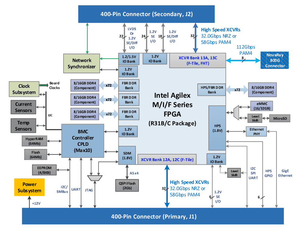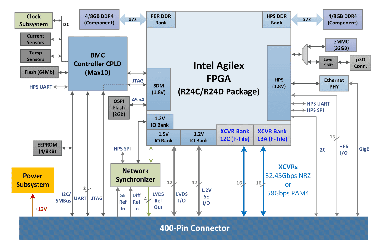Altera Agilex™ 7 eSOM™ module with up to 2.4Tbps transceiver bandwidth, 58/112Gbps PAM4, x16 PCIe Gen4, quad-core A53 ARM processor, and flexible clocking with integrated network synchronizer for high-performance embedded, edge, wireless, and networking designs.