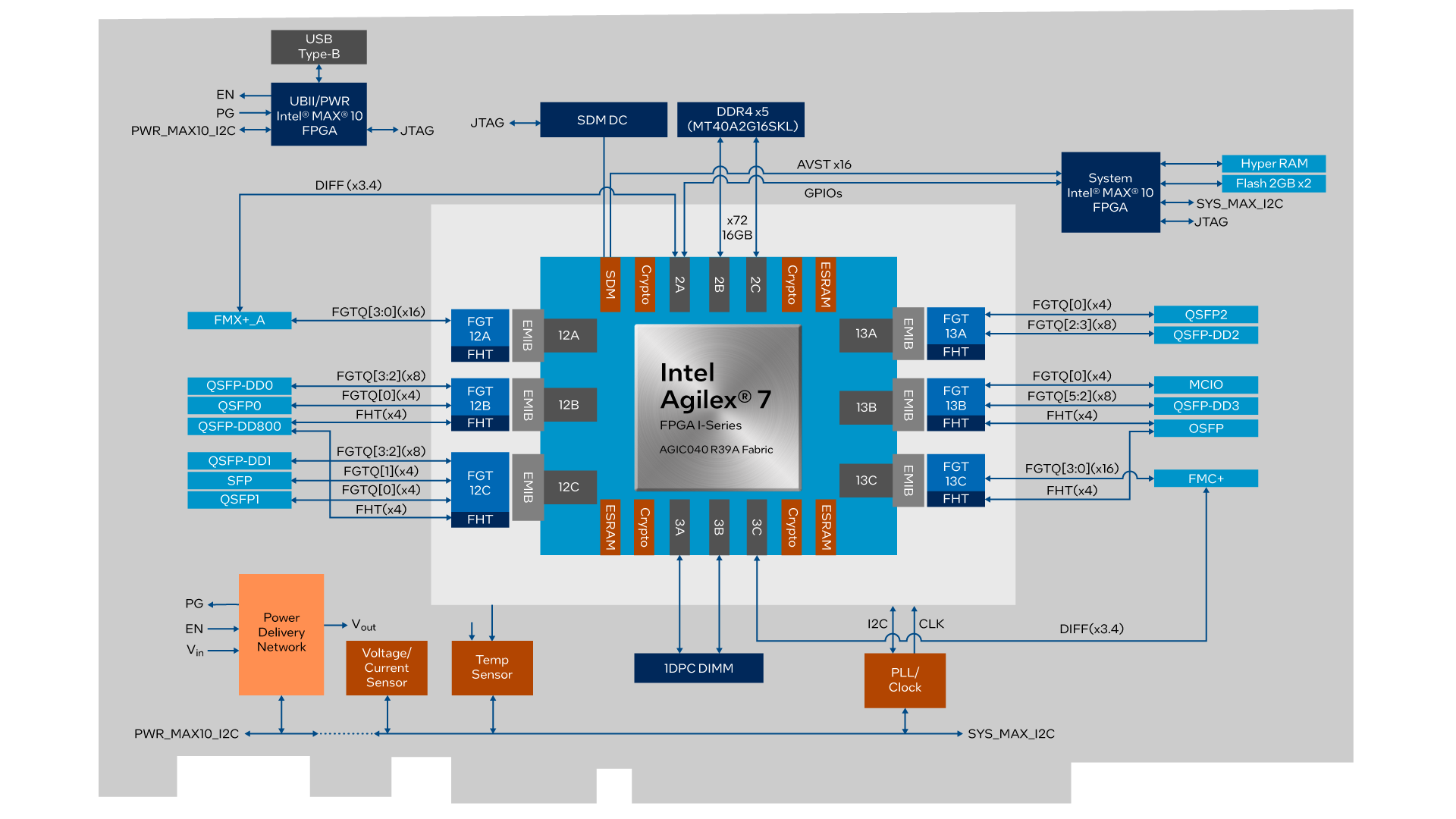 [DISCONTINUED] DK-SI-AGI027FC: The Agilex™ 7 FPGA I-Series Transceiver-SoC Development Kit is a signal integrity-focused platform for evaluating high-speed transceivers on Agilex I-Series FPGAs, featuring SMA connectors, MXMP and QSFP-DD ports for direct measurement.