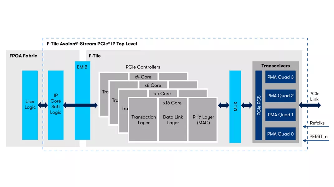 F-Tile is an FPGA companion tile that supports PCI Express* configurations up to PCIe 4.0 x16 in Endpoint (EP), Root Port (RP) and Transaction Layer (TL) Bypass modes. PCIe 3.0 and 4.0 configurations are natively supported.