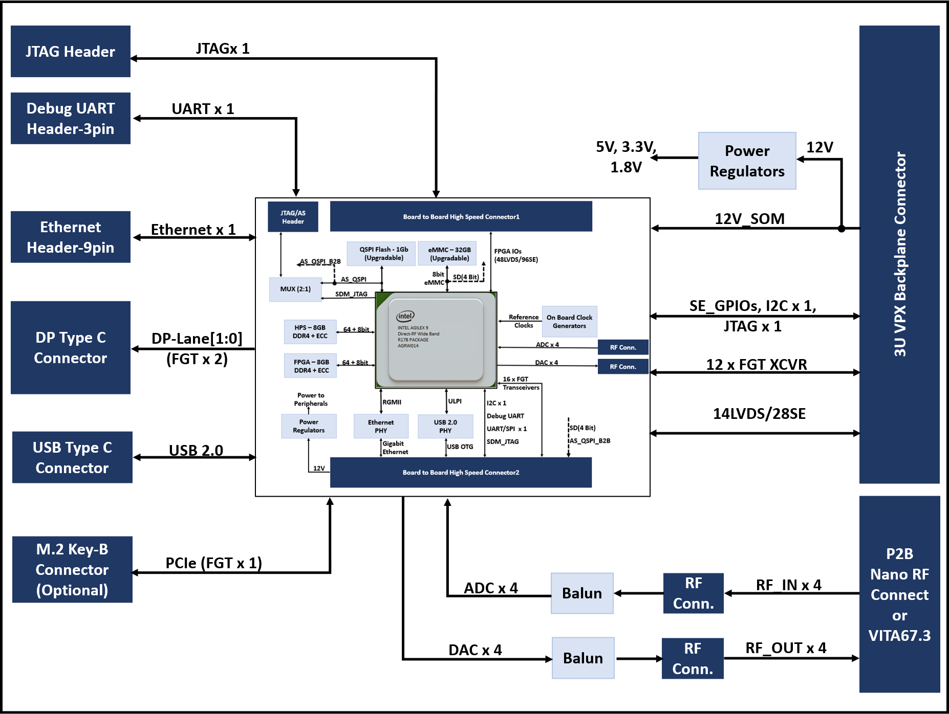 The iG-G67D is a feature-rich development kit based on Agilex™ 9 SoC FPGA (R17B package – AGRW014 device), designed to accelerate the development of direct RF and high-speed signal processing applications. Featuring 4 ADCs and 4 DACs with sampling rates up to 64Gsps, 16 transceivers up to 58Gbps (PAM4), and up to 1.43 million logic elements, the platform delivers exceptional performance in a compact 82mm x 110mm form factor. With 8GB DDR4 for both HPS and FPGA, along with eMMC and QSPI storage, it is ideal for rapid prototyping in defense, 5G, and advanced test and measurement systems.