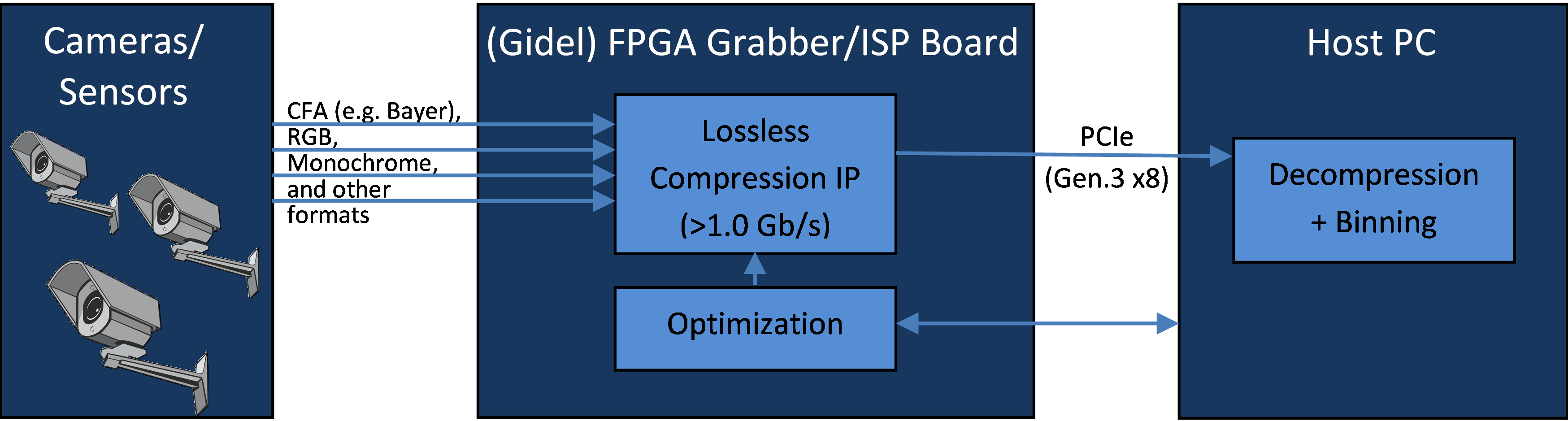 Gidel’s lossless compression IP targeting FPGA performs real-time compression for Color Filter Array (CFA – e.g., Bayer), Monochrome, and RGB images and videos. The IP enables compression of multi-camera/sensor inputs at pixel clock rates exceeding 1 gigapixel/s while using very small FPGA resources and minimal power consumption. The compression is highly efficient and, in real-case video applications, has achieved a lossless compression ratio of 1:2.3. The Lossless IP can be embedded seamlessly in Gidel's image acquisition systems, including the Gidel frame grabbers and compact edge computers. The compression supports high-end camera streaming, including 10+ GigE Vision, CoaXPress and Camera Link. Gidel's real-time compression IPs are particularly beneficial for high-bandwidth and high-resolution imaging and vision application enabling increased recording time, reduced storage size, and reduced post recording data offload and compression time on host computer.