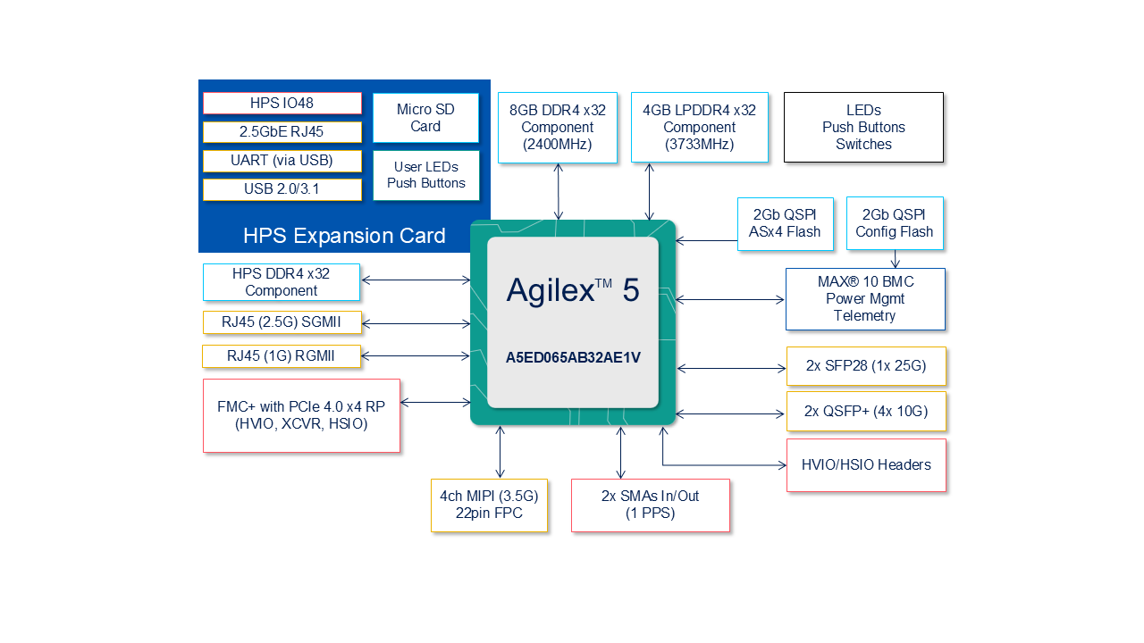 The iW-RainboW-G58M is a compact, high-performance System on Module (SoM) based on Agilex™ 5 E-Series SoC FPGA, designed to meet the demands of edge AI, high-speed networking, and embedded computing applications. Featuring compatibility with both Group A and B B32A package variants (from A5E 065 to A5E 008), the SoM integrates a dual-core Arm® Cortex®-A76 processor running up to 1.8 GHz alongside a dual-core Cortex-A55 at 1.5 GHz, delivering powerful heterogeneous processing capabilities. It supports up to 656K logic elements in the FPGA fabric and includes 2GB LPDDR4 for HPS and 4GB LPDDR4 for FPGA logic, making it well-suited for low-latency, compute-intensive tasks.The module offers 24 transceivers operating up to 28Gbps, enabling high-speed data movement in bandwidth-sensitive applications such as 5G edge, video analytics, and defense. It also includes an integrated 2.5G Ethernet PHY, USB ULPI, 16GB eMMC (expandable), and a rich set of I/Os including LVDS, HVIO, RGMII, USB 3.0, S